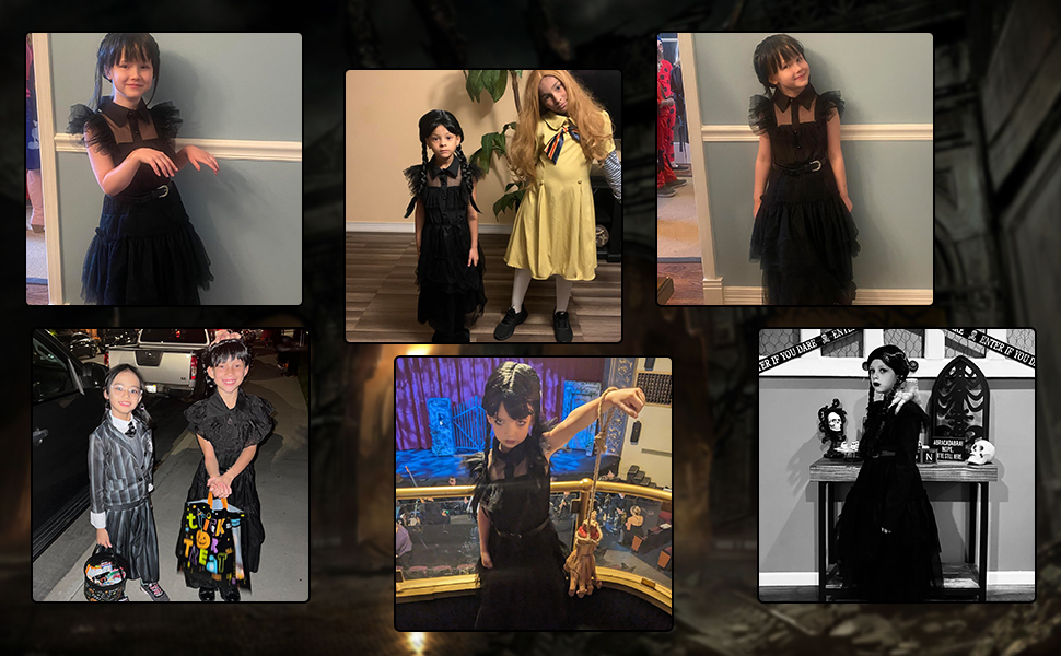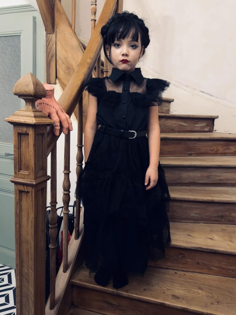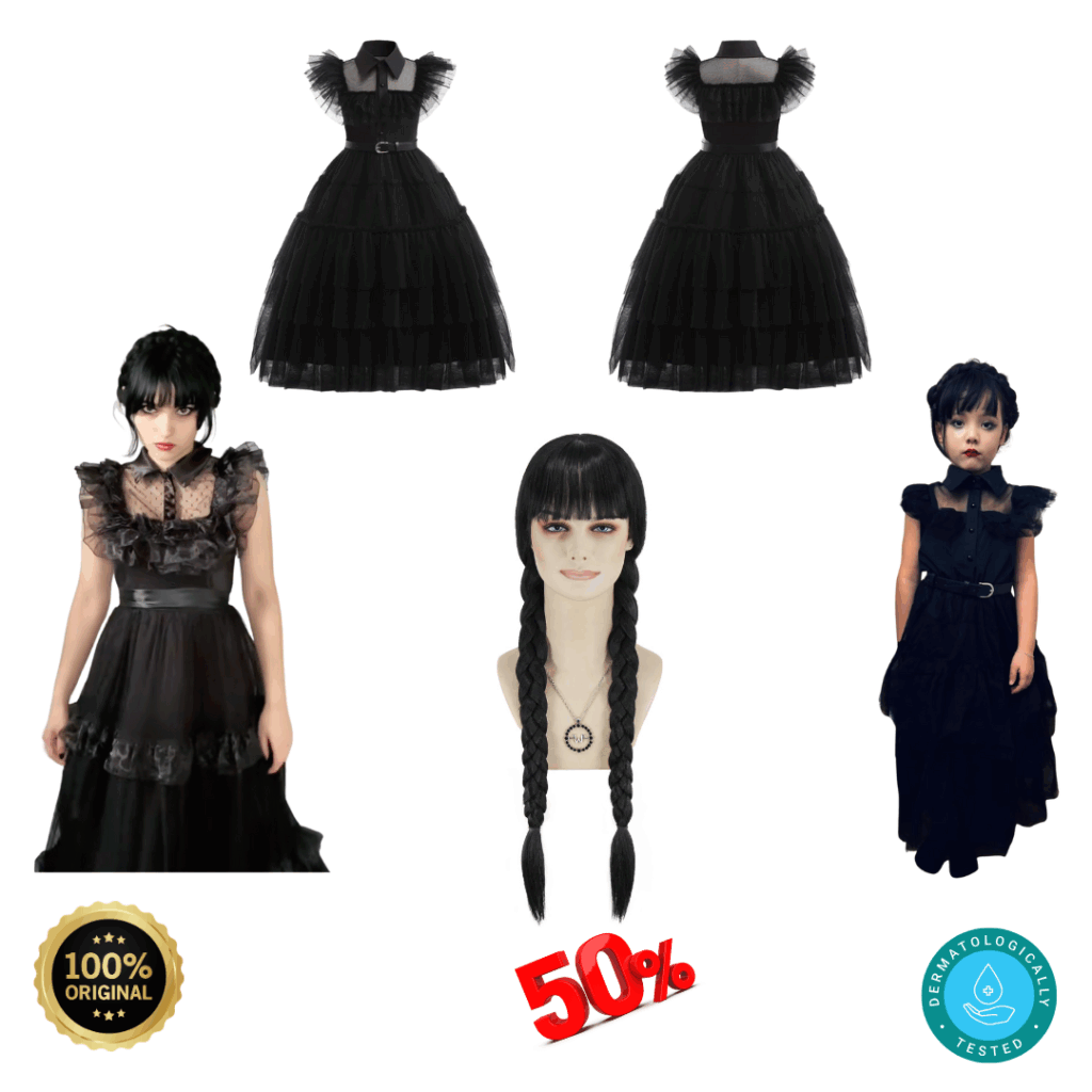 Un travestimento completo, Dimentica la ricerca degli accessori! Il nostro set include non solo il vestito, ma anche la mano ,una parrucca, cintura, calze e un set completo di gioielli (orecchini, collana, braccialetto e anello). Tutto il necessario per un travestimento da vera Mercoledì , pronto all’uso.