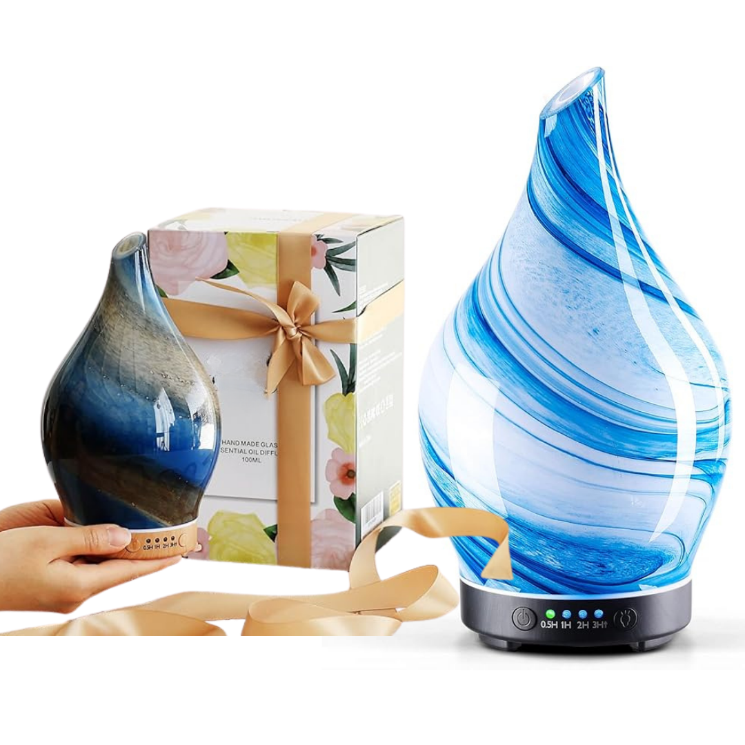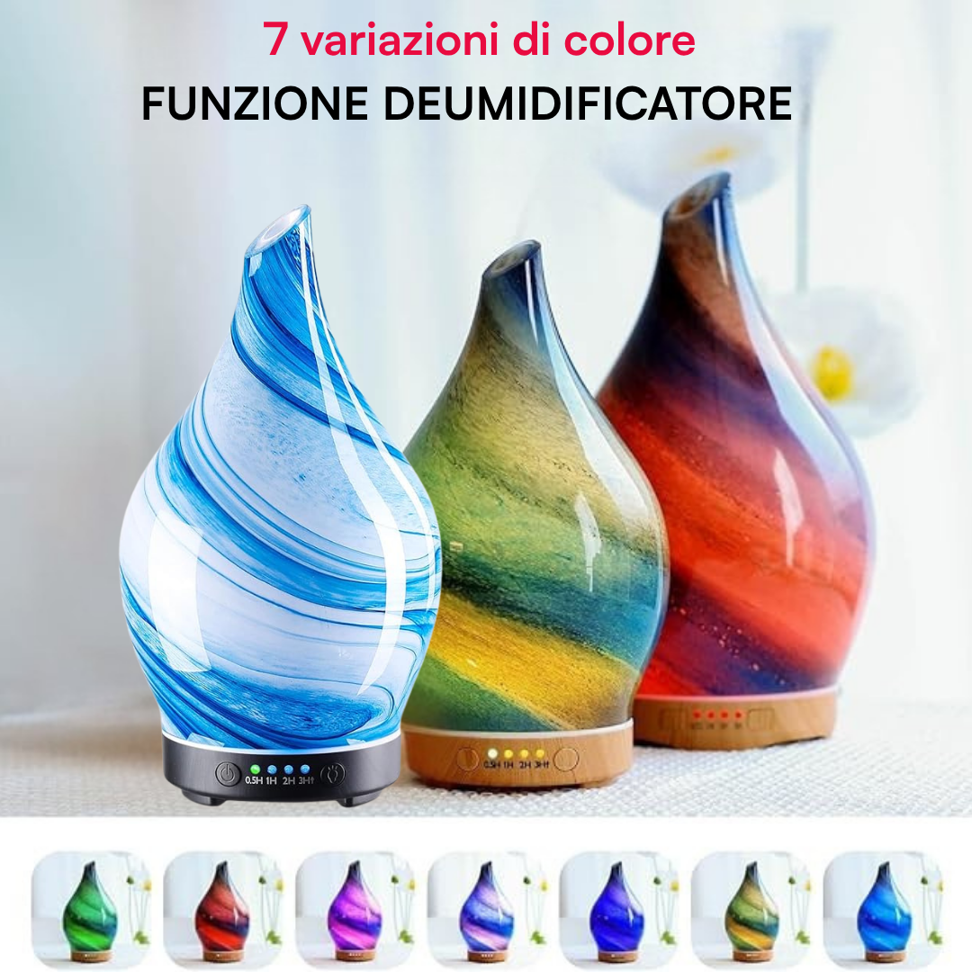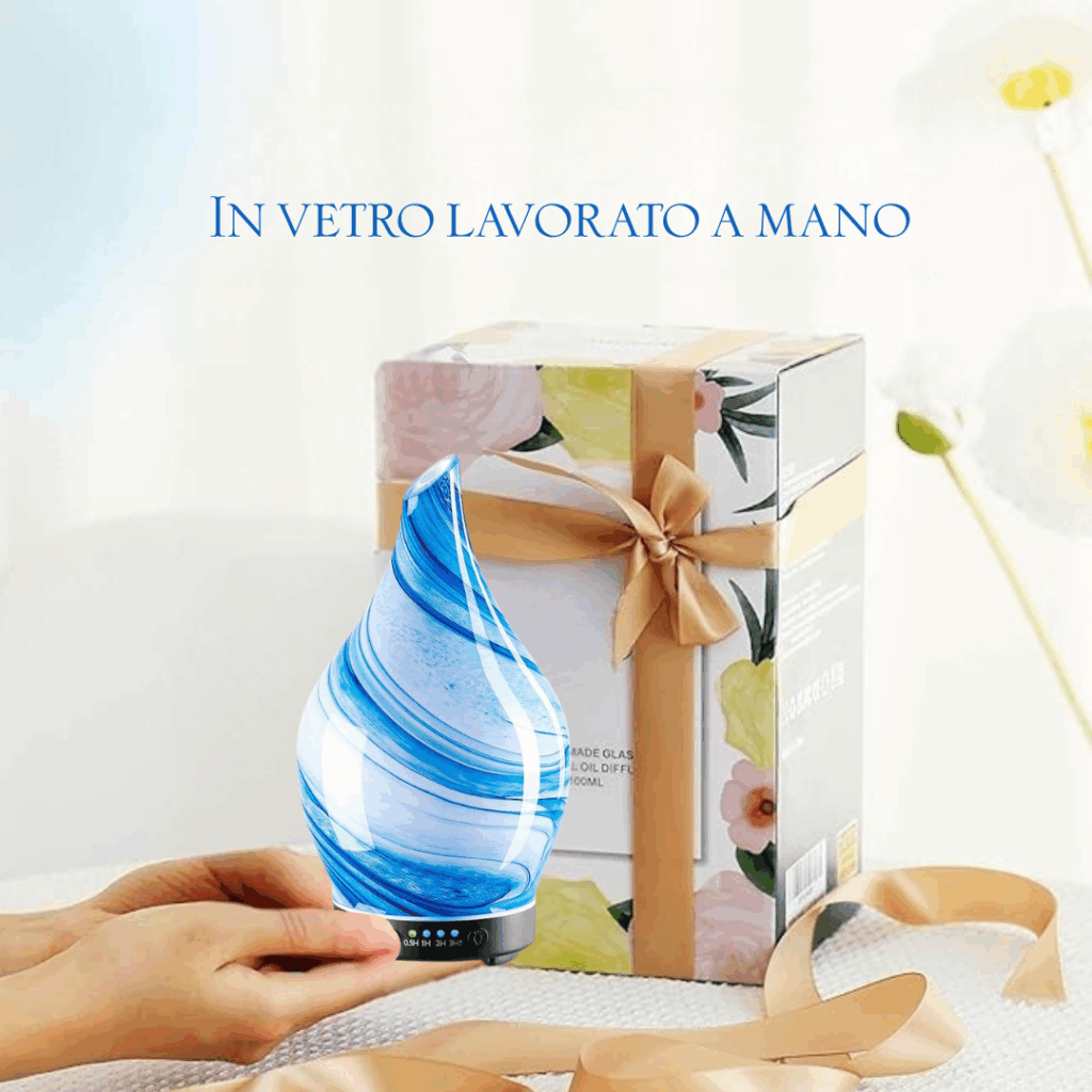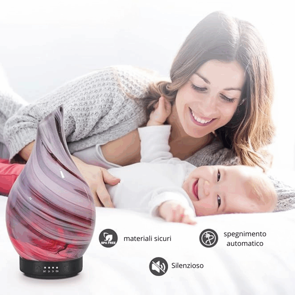 Esclusivo diffusore aromi , in vetro ,deumidifica l'aria , e rilascia nella stanza una fragranza che rilassa e non rende secca la gola, aiutando a dormire tutta la notte.