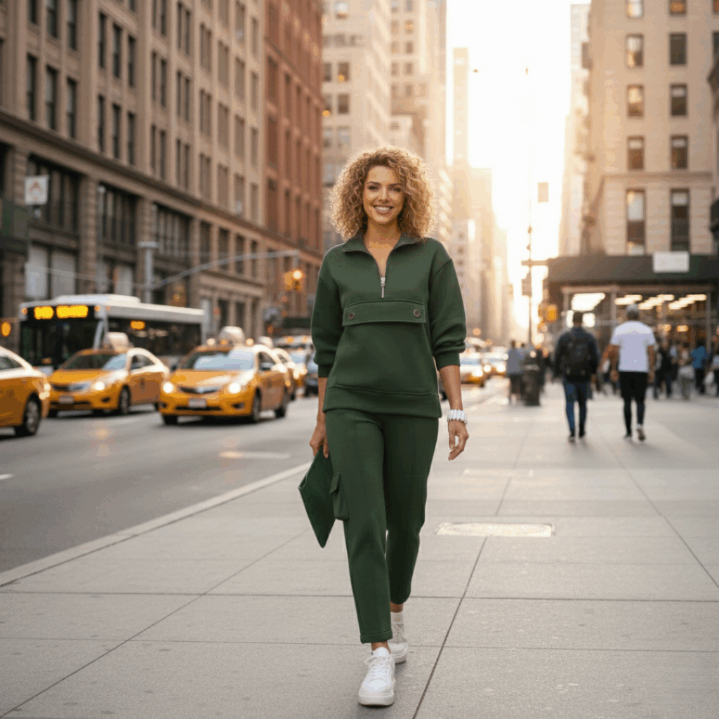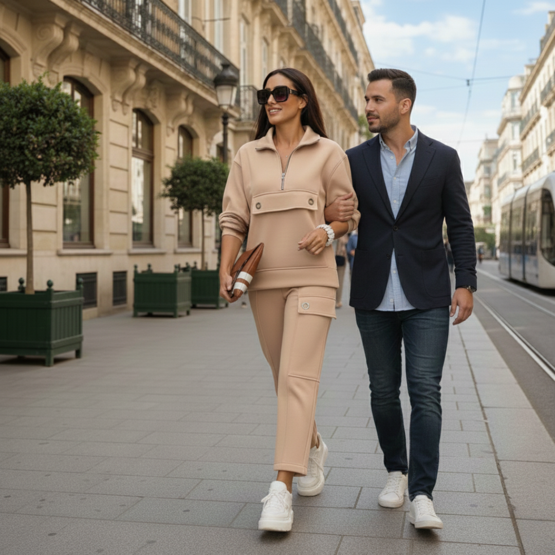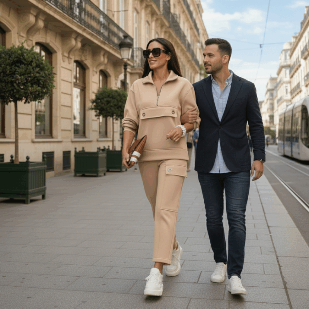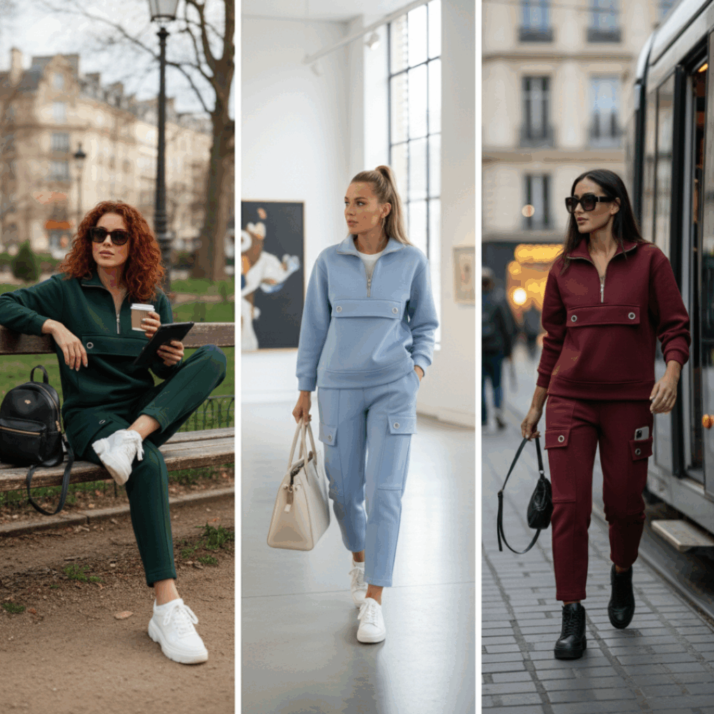 Questo set non è limitato a un solo contesto. È pensato per l’ambiente urbano dinamico: può essere indossato per un appuntamento casual, un viaggio, ma anche in contesti lavorativi più informali grazie al suo aspetto curato. La mezza zip e le tasche cargo non sono solo elementi di design, ma offrono praticità. La zip permette di variare lo scollo e lo stile, mentre le tasche rendono l’outfit funzionale, permettendoti di tenere a portata di mano gli oggetti essenziali.