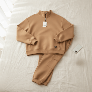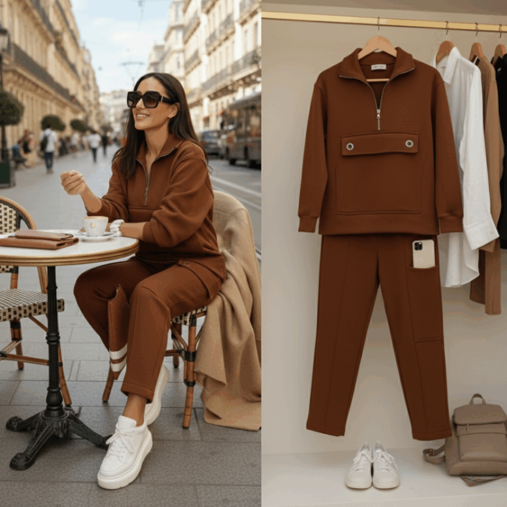 La scelta del design athleisure e della tonalità neutra (cammello/marrone) rende questo completo immune alle mode passeggere. Non è un capo stagionale, ma un elemento fondamentale del guardaroba. Investire in questo set significa acquistare un capo di alta qualità che può essere utilizzato e riproposto in diversi modi per anni, offrendo un elevato valore nel tempo