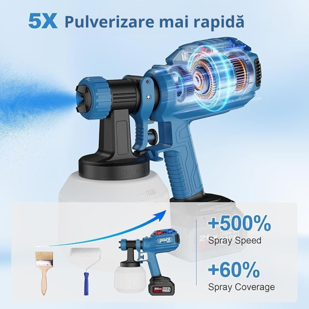 Pistol de pulverizare revoluționar cu baterie dublă, care asigură o funcționare continuă de până la 40 de minute fără a obosi mâinile și brațele.